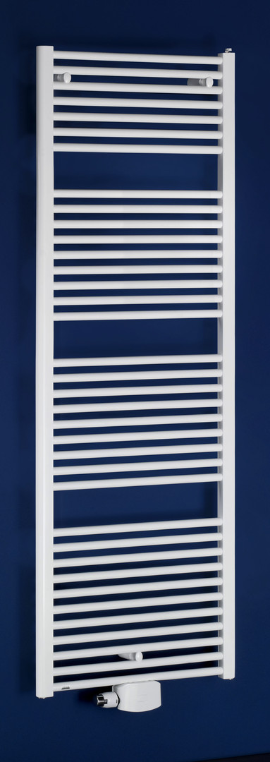 für Zentralheizung (zusätzliche Ausstattung mit Elektroheizstab) und für die Erwärmung von Handtüchern und Textilien, horizontale Rundrohre 23 mm mit vertikalen rundum glatten Halbovalrohren 30 x 40 mm verbunden, mit 2-3 Aufnahmeöffnungen für Handtücher, mit M-Anschluss DN 15 x 50 mm mittig unten und 2 Anschlüssen DN 15 von unten, rechts und links außen, sowie 1 Entlüftungsanschluss DN 15 von oben rechts, Oberfläche pulverbeschichtet DIN 55900 und bei ca. 180 °C eingebrannt, serienmäßiges Zubehör: Entlüftungsstopfen DN 15 in vernickelter Ausführung mit Spezialdichtung, 3 tiefenverstellbare, von vorn fixierbare Befestigungen erfüllen AK 2-3 nach VDI 6036 je nach Baugröße, mit 3 Sechskant-Holzschrauben und Dübeln. Wärmeleistungen ?S nach DIN EN 442-2, Heizmedium Wasser: max. zul. Betriebstemperatur 100 °C, max. zul. Betriebsüberdruck 10 bar