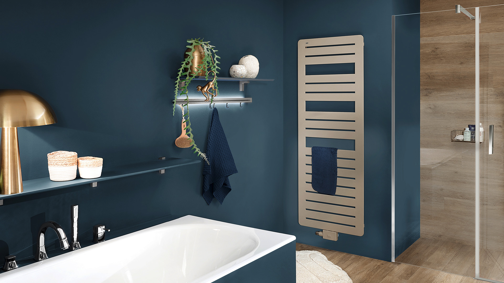 für den Zentralheizungsbetrieb, flacher Heizkörper aus umlaufenden und horizontalen Flachprofilrohren 70 x 11 mm, die übergangslos verbunden sind, mit 2-3 Öffnungen für Einhängen und Erwärmen von Handtüchern und Textilien, M-Anschluss DN 15 (1/2") x 50 mm mittig unten, Oberfläche pulverbeschichtet DIN 55900 und bei ca. 180 °C eingebrannt, serienmäßiges Zubehör 1 Entlüftungsstopfen DN 15 (1/2") und 4 Befestigungen, erfüllen AK3 nach VDI 6036, mit Sechskant-Holzschrauben und Düblen, Heizmedium Wasser, max. zul. Betriebstemperatur 100 °C, max. zul. Betriebsüberdruck 4 bar
