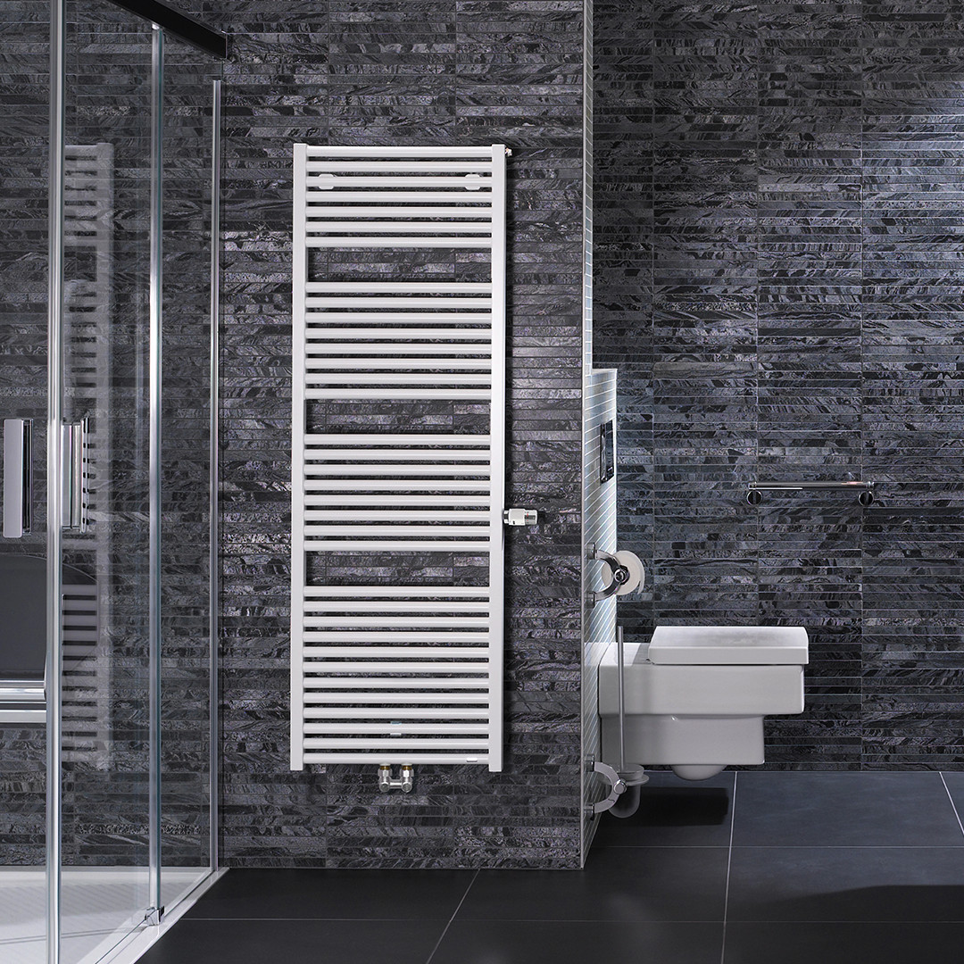 für Zentralheizung (zusätzliche Ausstattung mit Elektroheizstab) und für die Erwärmung von Handtüchern und Textilien, horizontale Rundrohre 25 mm mit vertikalen Quadratrohren 30 x 30/32 x 33 mm verbunden, Quadratrohre mit gerundeten Kanten, mit einseitig angeordnetem Einbauventil mit Thermostat Puro (weiß/chrom für weiße und chrom/chrom für farbige Rondo V) mit eingebautem Flüssigkeitselement und verchromter Griffhülse mit ertastbaren Einstellhilfen, rundum glatte Oberfläche, wendbar bei der Montage für Thermostatanordnung wahlweise rechts oder links, mit 2-3 Aufnahmeöffnungen für Handtücher, mit M-Anschluss DN 15 x 50 mm mittig unten und 2 Anschlüssen DN 15 von unten reichts und links außen, sowie 1 Enlüftungsanschluss DN 15 seitlich oben, Oberfläche pulverbeschichtet DIN 55900 und bei ca. 180 °C eingebrannt, serienmäßiges Zubehör: Thermostat Puro, 1 Entlüftungsstopfen DN 15 sowie 2 Blindstopfen DN 15 in vernickelter Ausführung mit O-Ring, 2 Befestigungen aus Aluminium-Druckguss, tiefenverstellbar, 2 Sechskant-Holzschrauben erfüllen AK 2-3 nach VDI 6036, mit 2 Dübeln sowie Klemmhalter mit Distanzschraube, Wärmeleistungen nach DIN EN 442-2, Heizmedium Wasser, max. zul. Betriebstemperatur 100 °C, max. zul. Betriebsüberdruck 10 bar