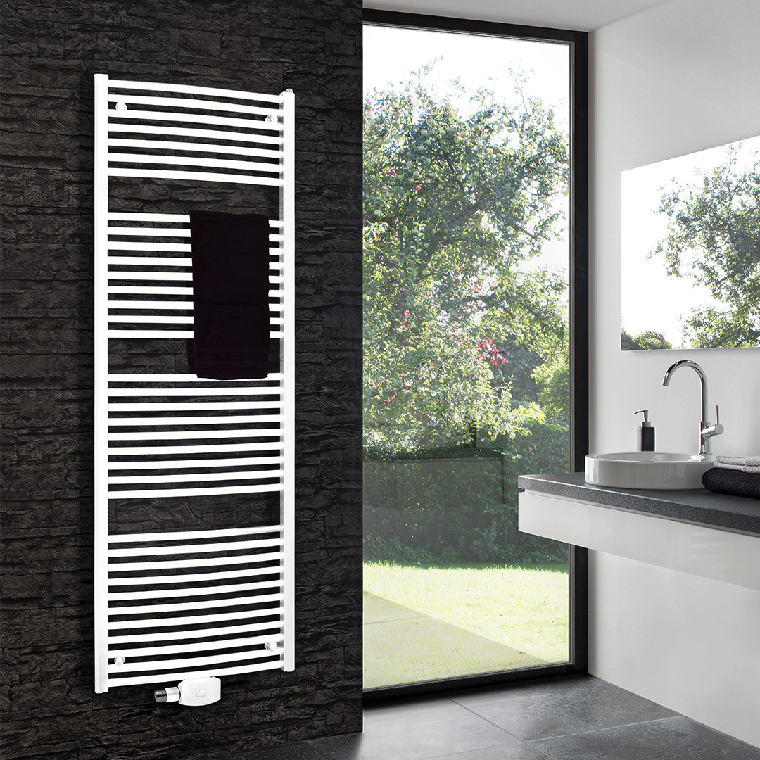 für Zentralheizung (zusätzliche Ausstattung mit Elektroheizstab) und für die Erwärmung von Handtüchern und Textilien, horizontale, gebogene Rundrohre 23 mm mit vertikalen rundum glatten Halbovalrohren 30 x 40 mm verbunden, so dass sich der Heizkörper in einem Bogen nach vorn wölbt, mit 2-3 Aufnahmeöffnungen für Handtücher, mit M-Anschluss DN 15 x 50 mm mittig unten und 2 Anschlüssen DN 15 von unten, rechts und links außen, sowie 1 Entlüftungsanschluss DN 15 von oben rechts, Oberfläche pulverbeschichtet DIN 55900 und bei ca. 180 °C eingebrannt, serienmäßiges Zubehör: Entlüftungsstopfen DN 15 in vernickelter Ausführung mit Spezialdichtung, 4 tiefenverstellbare von vorn fixierbare Befestigungen erfüllen AK 3 nach VDI 6036 je nach Baugröße, mit 4 Sechskant-Holzschrauben und Dübeln, Wärmeleistungen nach DIN EN 442-2, Heizmedium Wasser, max. zul. Betriebstemperatur 100 °C, max. zul. Betriebsüberdruck 10 bar