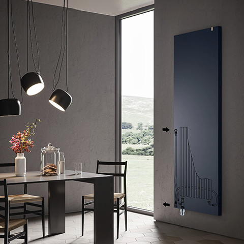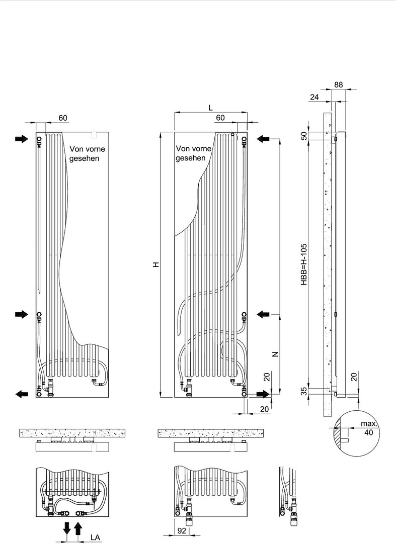 für Zentralheizung, mit einem Grundkörper in geschweißter Ausführung aus horizontalen Rundrohren 30 mm und vertikal nebeneinander angeordneten Rundrohren 18 mm in 2-reihiger Ausführung, plane Front mit kubistischen Seitenblenden kraft- und wärmeschlüssig mit Grundkörper verbunden, plane Front verblendet gleichzeitig die seitlichen oder unteren Rohrleitungsanschlüsse und das unten positionierte Ventil und die Rücklaufverschraubung, lediglich der Bedienknauf des Thermostaten ist sichtbar, flexible Anschlussschläuche ermöglichen unterschiedlichste seitliche Anschlussabstände links, rechts oder unten, Oberfläche pulverbeschichtet DIN 55900, Serienmäßiges Zubehör: 1 Ventil mit Verschraubung DN 15 (1/2") x DN 20 (3/4") und 2 absperrbare Verschraubungen AG DN 15 (1/2") x AG DN 20 (3/4") Eurokonus für Klemmringverschraubungen sowie 2 Anschlussschläuche IG DN 15 (1/2") flachdichtend, Thermostat Puro verchromt, 2 Befestigungen oben und 1 Abstandhalter unten, mit Schrauben und Dübel, Wärmeleistungen nach EN 442, Heizmedium Wasser, max. zul. Betriebstemperatur 95 °C, max. zul. Betriebsüberdruck 10 bar