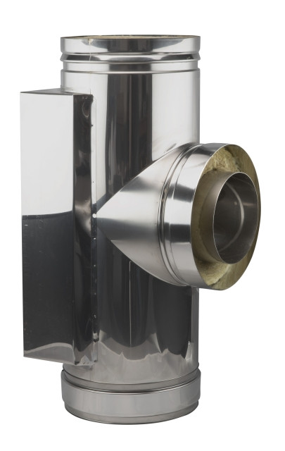 industriell gefertigtes, CE-zertifiziertes doppelwandiges Abgassystem in Elementbauweise mit einer Abgasführung aus hochwertigem Edelstahl, Werkstoff-Nr. 1.4571/1.4404 (0,4 mm), einem Außenmantel aus Edelstahl, Werkstoff 1.4301 (0,4/0,6 mm) und Isolierung