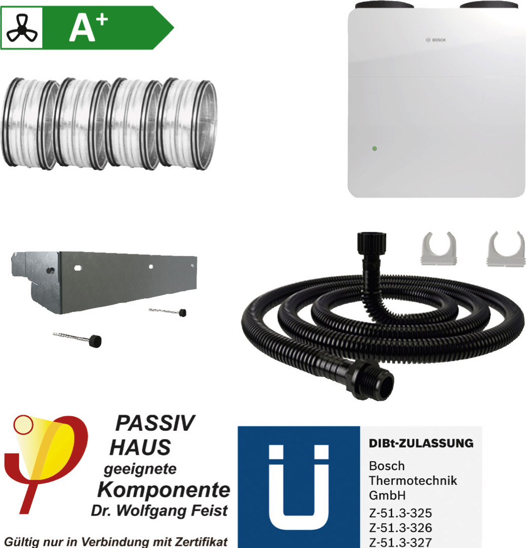 Bosch Kontrollierte Wohnungslüftung Paket bestehend aus 7 Komponenten. Wohnungslüftungspaket BOPA VE5 V5001 C 450, Wandkonsolen-Set