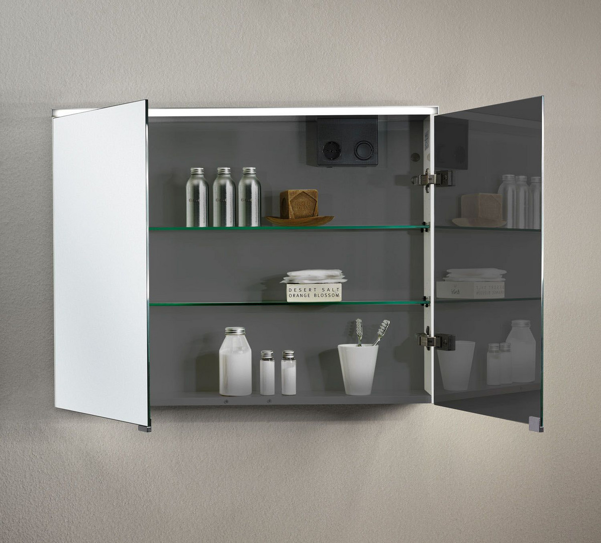 Spiegeltüren beidseitig verspiegelt, LED-Aufsatzleuchte, 4250 K, Glaseinlegeböden, Schalter-/Steckdosenelement, IP 24