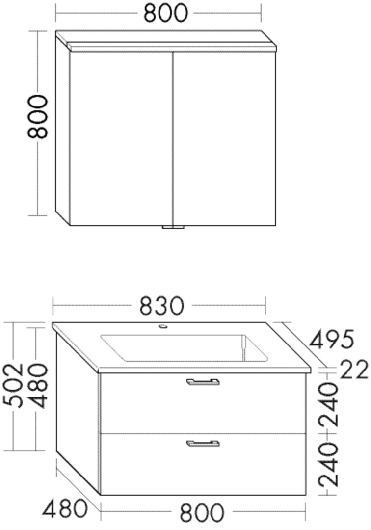 Spiegeltüren beidseitig verspiegelt, LED-Aufsatzleuchte, 7,5 W, Glaseinlegeböden, Schalter-/Steckdosenelement unten, Waschtisch: Muldentiefe 120 mm, Beckenmaß 568 x 291 mm, Waschtischunterschrank: 1 Schublade oben mit Siphonausschnitt, 1 Auszug unten, mit Raumsparsiphon