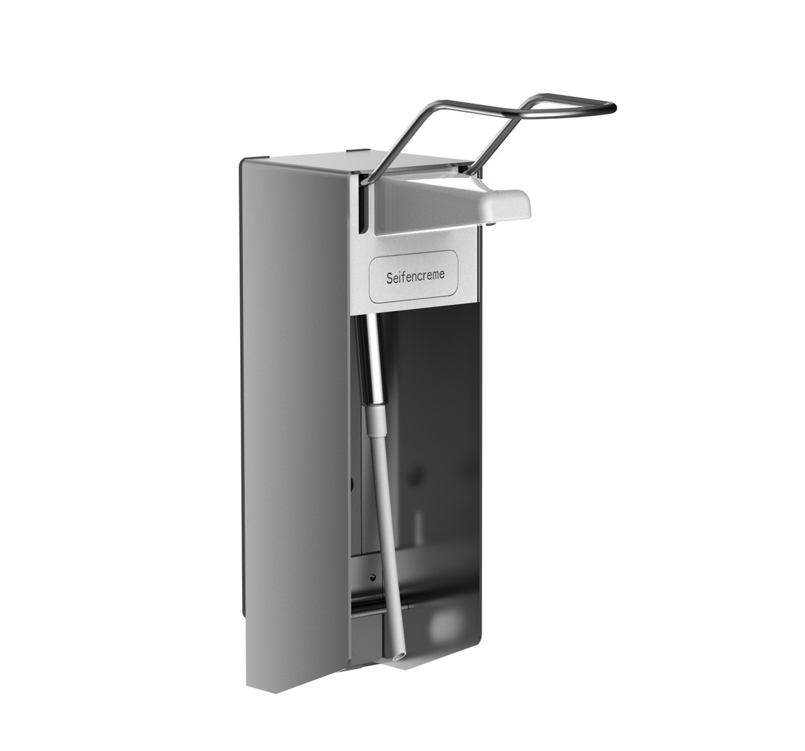 (H x B x T) 310 x 94 x 215 mm, für marktübliche 500 ml Standardflaschen zur Verwendung von alkoholischen Desinfektionsmitteln, flüssiger Seife oder fließfähiger Pflegelotion, mit langem und nach oben abgewinkeltem Edelstahlbedienhebel, autoklavierbar bis 121 °C und 1 bar, wartungsfreie und nach vorn herausziehbare Edelstahldosierpumpe mit geradem Ansaugrohr, Dosierung einstellbar, einsetzbar bei engen Platzverhältnissen unterhalb des Spenders, Spender in Einzelverpackung mit Montageanleitung, Befestigungsmaterial, Zubehörbeutel und je ein auswechselbarer Clip mit der Aufschrift „Seifencreme“ bzw. „Händedesinfektion“