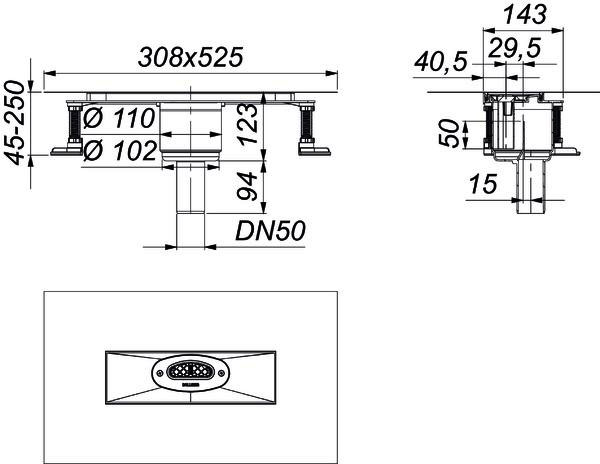 Bauhöhe 45 mm (ohne Montagefüße 30 mm), zum Einbau mit Duschrinnen CeraFloor, CeraWall, CeraFrame Individual, Zentrix, CeraNiveau und CeraFrame Liquid senkrecht, integrierte Estrichverankerung, flexible Dichtmanschette zum sicheren Anschluss an Verbundabdichtungen gemäß DIN 18534, vorgefertigter Randdämmstreifen, schallentkoppelte Montagefüße zur Fixierung und Höheneinstellung 45-250 mm, herausnehmbarer Geruchs- und Reinigungsverschluss, Sperrwasserhöhe 50 mm (gemäß DIN EN 1253), Haarsieb (optional einsetzbar), Bauschutzabdeckung, Ablaufgehäuse und Ablaufstutzen Polypropylen, hochschlagfest