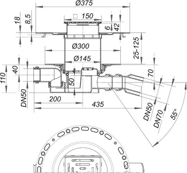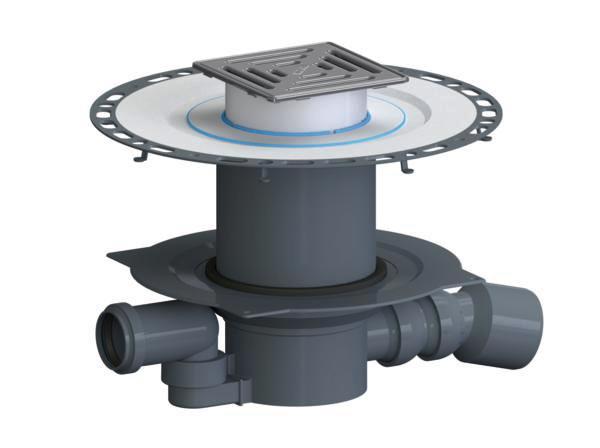 nach DIN EN 1253, Komplettablauf bestehend aus Bodenablaufgehäuse 55 (Ablaufgehäuse mit Geruchsverschluss und Reinigungsöffnung, diese ermöglicht den Zugang zu Geruchsverschluss und Ablaufstutzen), TistoDrain Aufstockelement S 15 und Aufsatz VC 15, Aufsatz stufenlos bis zu 35 mm höhen- und bis zu +/-13 mm seitenverstellbar