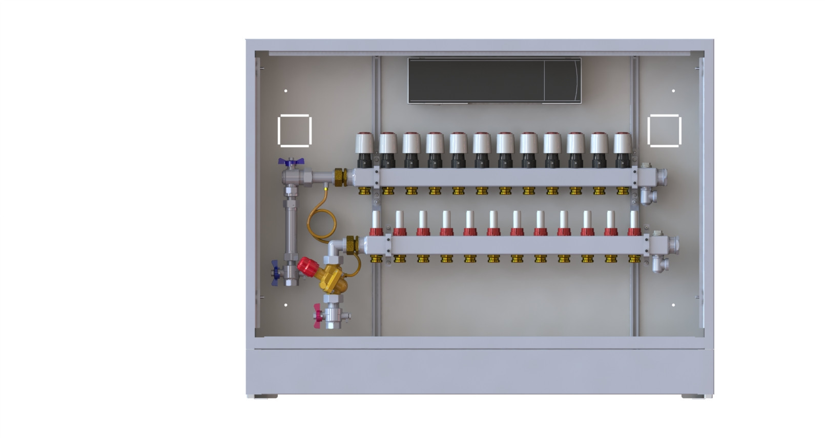 vormontierte druckunabhängige Verteilerstation für Fußbodenheizung mit Edelstahl-Heizkreisverteiler Danfoss SSM mit Durchflussanzeige und voreinstellbaren Ventileinsätzen, Heizkreisanschlüsse G 3/4“ Eurokonus mit Anschlussset mit Danfoss AB-PM und Passstück für den Energiezähleranschluss mit zwei Kugelhähnen, steckerfertige verdrahtete Danfoss Icon2 Regelung und thermische Stellantriebe Danfoss TWA 230 V im Unterputz Verteilerschrank aus Stahlblech, weiß lackiert