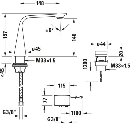 Duravit Elektronik-2-Loch-Waschtisch-Armatur M D.1 Ausladung 148mm, mit Steckernetzteil, ohne Zugstangen-Ablaufgarnitur, chrom W336368