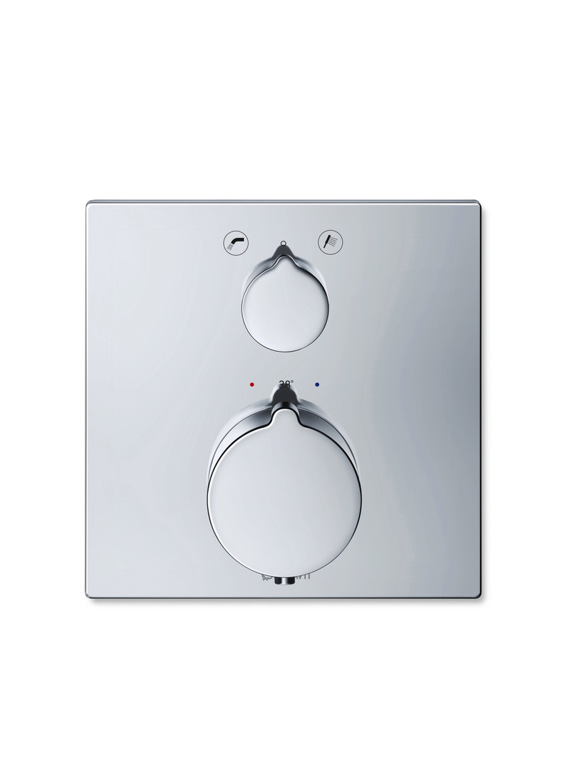 Anschlussart Grundkörper, Thermostatkartusche, 2 Verbraucher, Sicherheitssperre bei 38 °C, eckige Rosette 150 x 150 mm, Durchflussmenge 20,6 l/min (3 bar), Umstellung Wanneneinlauf/Handbrause, mit Sichtteile und Funktionseinheit, empfohlener Betriebsdruck 3-5 bar