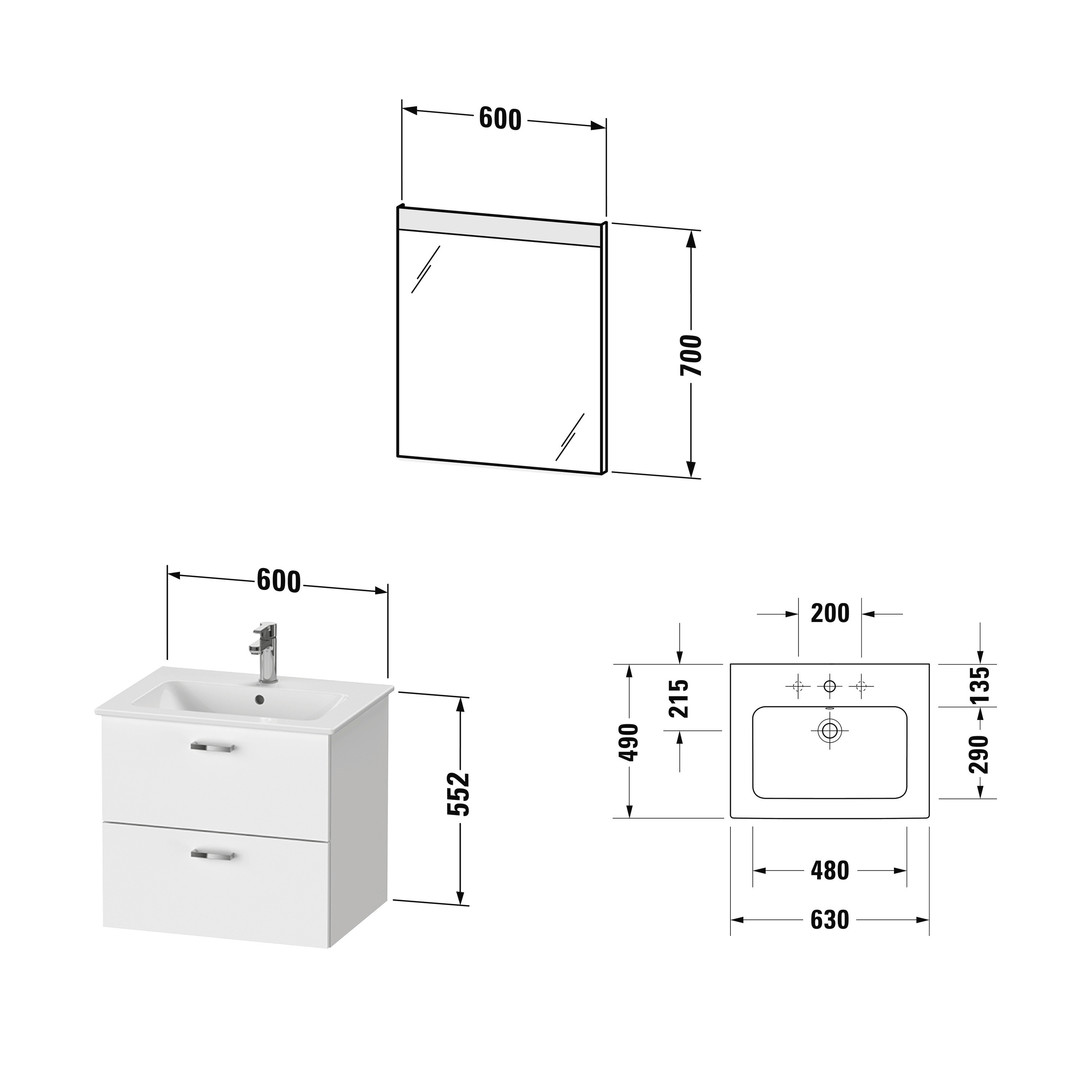 Duravit Möbel-Set XBase 63x49cm, WT, WTU 2 Schubkästen, Spiegel, weiß glänzend W475911
