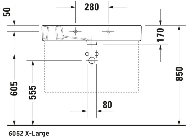 Unterseite glasiert, Raumsparsiphon wird empfohlen in Verbindung mit Waschtischunterbau, zur Befestigung ab der Größe 100 cm werden zwei Befestigungen Artikel Nr. 6951000000 benötigt