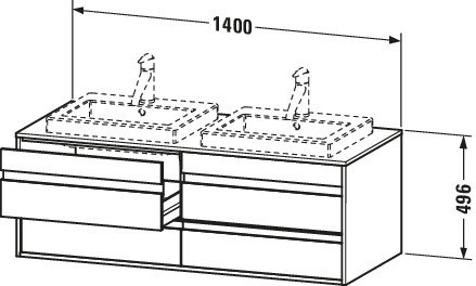 wandhängend, 1 Konsolenplatte mit wahlweise einem oder zwei Ausschnitten, Schubkästen unter dem Becken mit Siphonausschnitt und Schürze, für 1 bis 2 Einbauwaschtische, Raumsparsiphon 005076 ist empfehlenswert