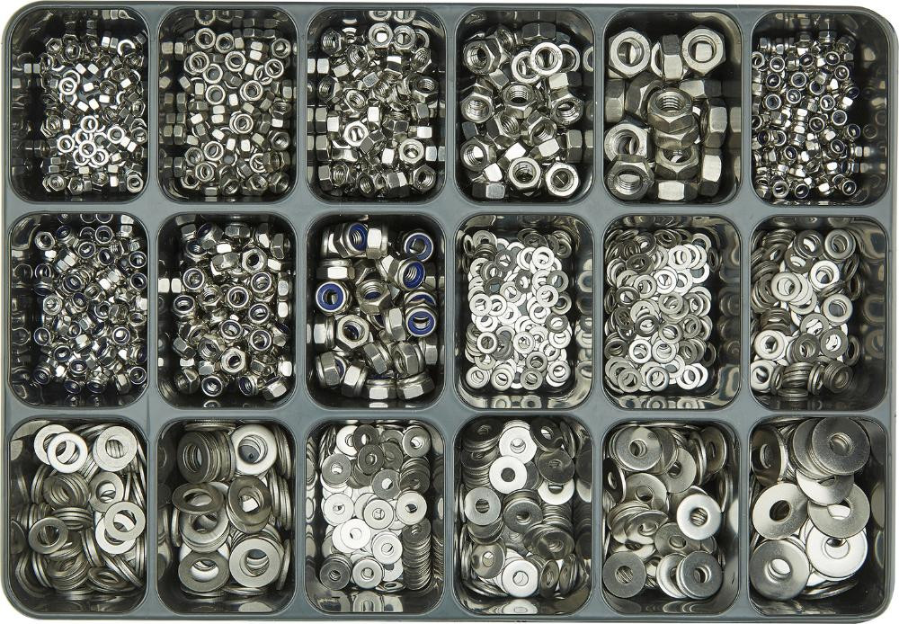 • 1525-teiliges Edelstahl A2-Sortiment: Muttern, DIN 934; Sicherungsmuttern, DIN 985 und Scheiben, DIN 125 + DIN 9021