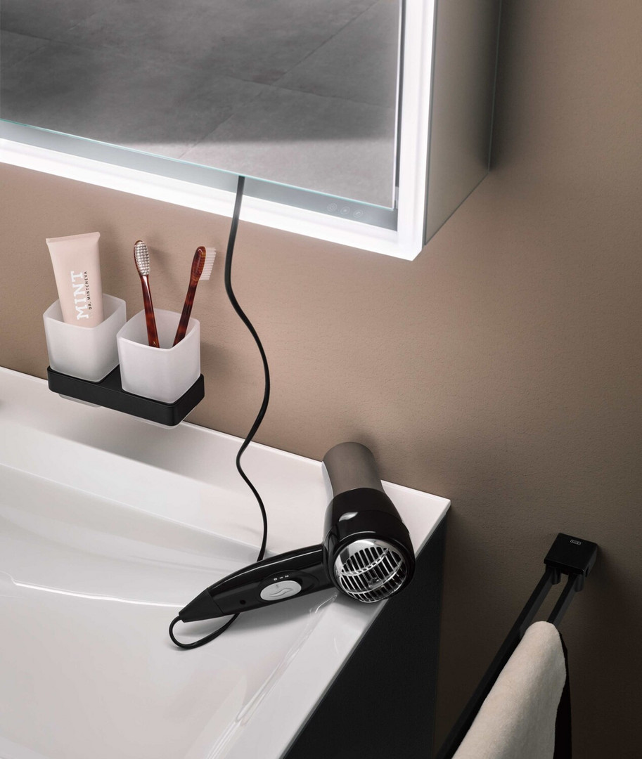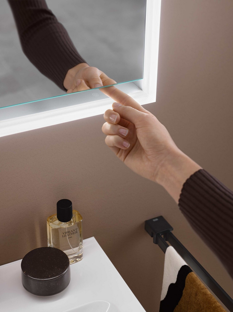IP 20, Seitenwände verspiegelt, mit verspiegelter- oder weißer Rückwand, 2 stufenlos einstellbare Ablagen, 1 Steckdose, Lichtsteuerung über 3 kapazitive von außen bedienbare Touch-Bedienfelder (An/Aus, Helligkeit und Lichtfarbe - kalt/warm - stufenlos einstellbar), Kabeldurchlass nach außen bei geschlossenen Spiegeltüren