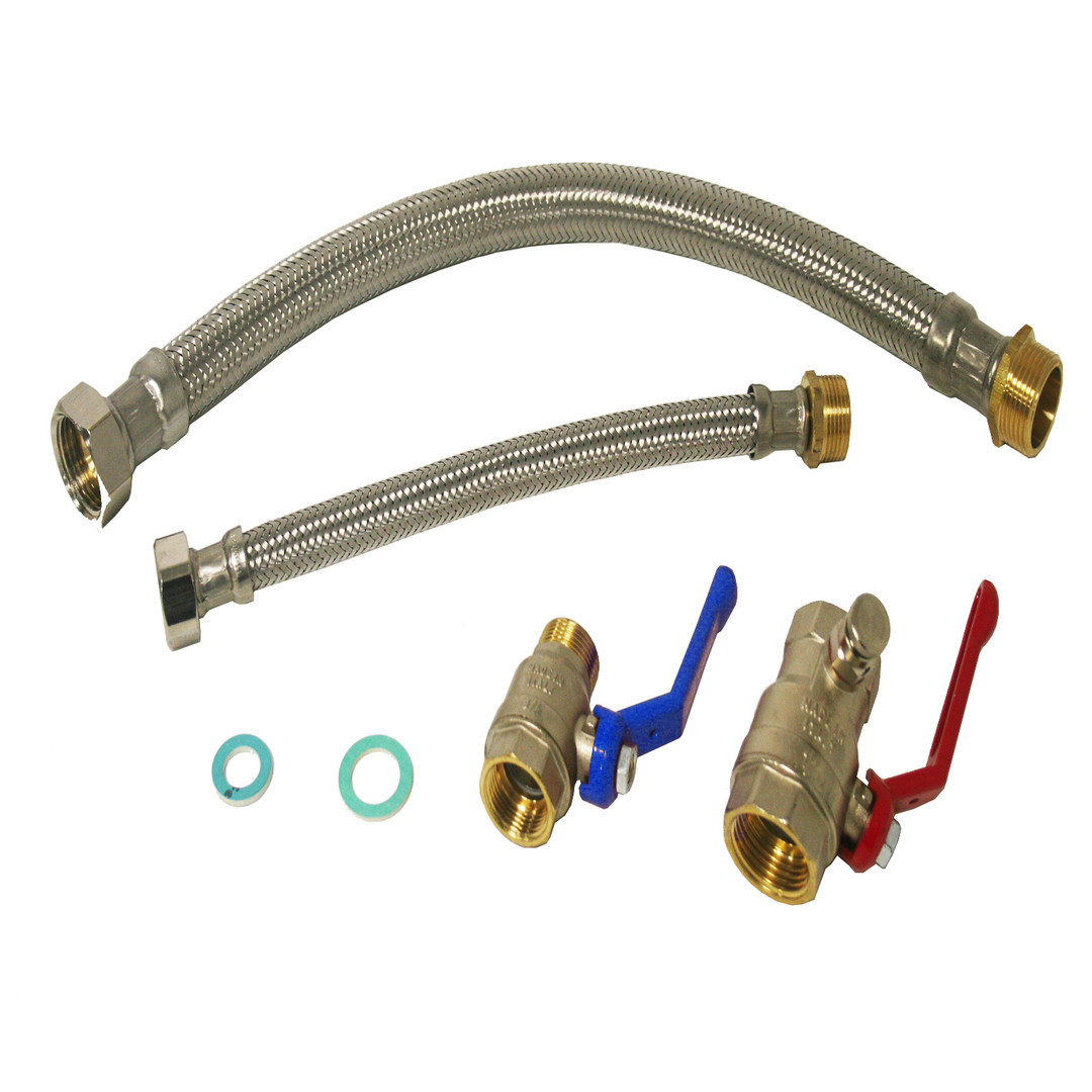 bestehend aus Panzerschlauch 1" NW 20 x 500 mm (ÜWM/AG) mit Dichtung, Panzerschlauch 3/4", 300 mm (ÜWM/AG) mit Dichtung mit KTW-DVGW-W270-Zertifizierung, Messing-Kugelhahn 1" IG/IG mit Entleerung, Messing-Kugelhahn 3/4" mit KTW-/DVGW-W270-Zertifizierung
