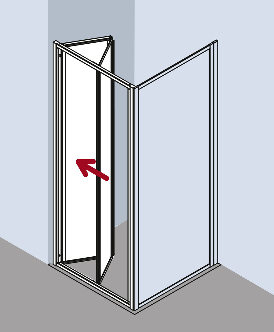 Glasstärke 3 mm, mit 2 Segmenten, nach einer Seite nach innen öffnend, Profile und Griffleisten aus eloxiertem Aluminium, Verstellmöglichkeit je Wandprofil 20 mm, durchgehende Magnetleisten und Dichtprofile, mit Bodenprofil (Höhe 32 mm), mit 1 Aufhänge-Knopf und Befestigungsmaterial
