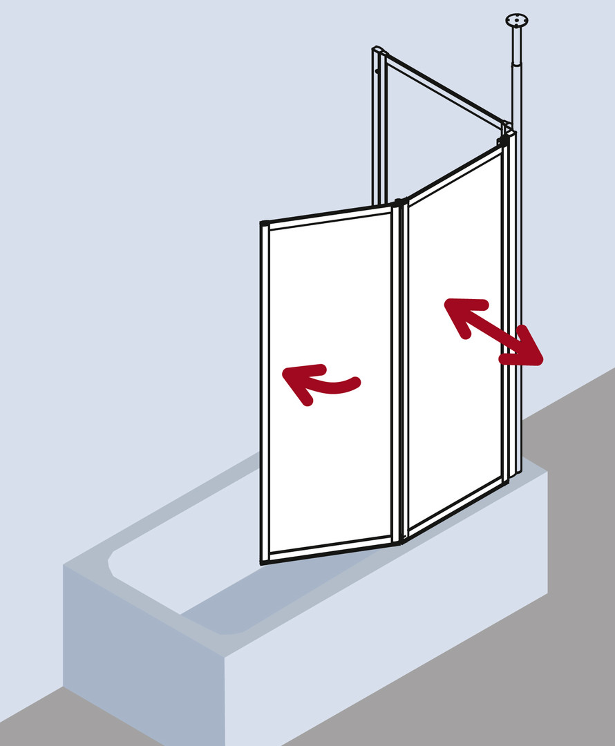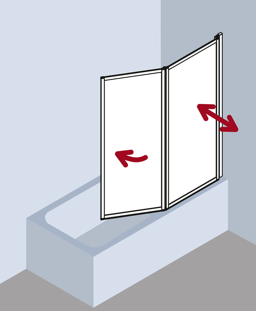 zum Einbau auf Badewanne, gerahmte Faltwand mit zwei Flügeln, im Wandprofil 90 Grad nach innen und außen schwenkbar, 2. Flügel 180 Grad nach innen schwenkbar, Verglasung 3 mm Einscheiben-Sicherheitsglas nach DIN EN 12150, Profile aus hochwertigem eloxiertem Aluminium, Verstellmöglichkeit im Wandprofil 16 mm, durchgehende Dichtprofile, waagerechte Dichtleisten, mit Befestigungsmaterial, Made in Germany, geprüft nach DIN EN 14428 (CE) und PPP 53005 (TÜV/GS), 20 Jahre Ersatzteil-Nachkaufsicherheit nach Auslauf des Modells, Qualitätssicherungssystem zertifiziert nach DIN EN ISO 9001:2015, Umweltmanagement zertifiziert nach DIN EN 14001:2015, Energiemanagement zertifiziert nach DIN EN 50001:2011