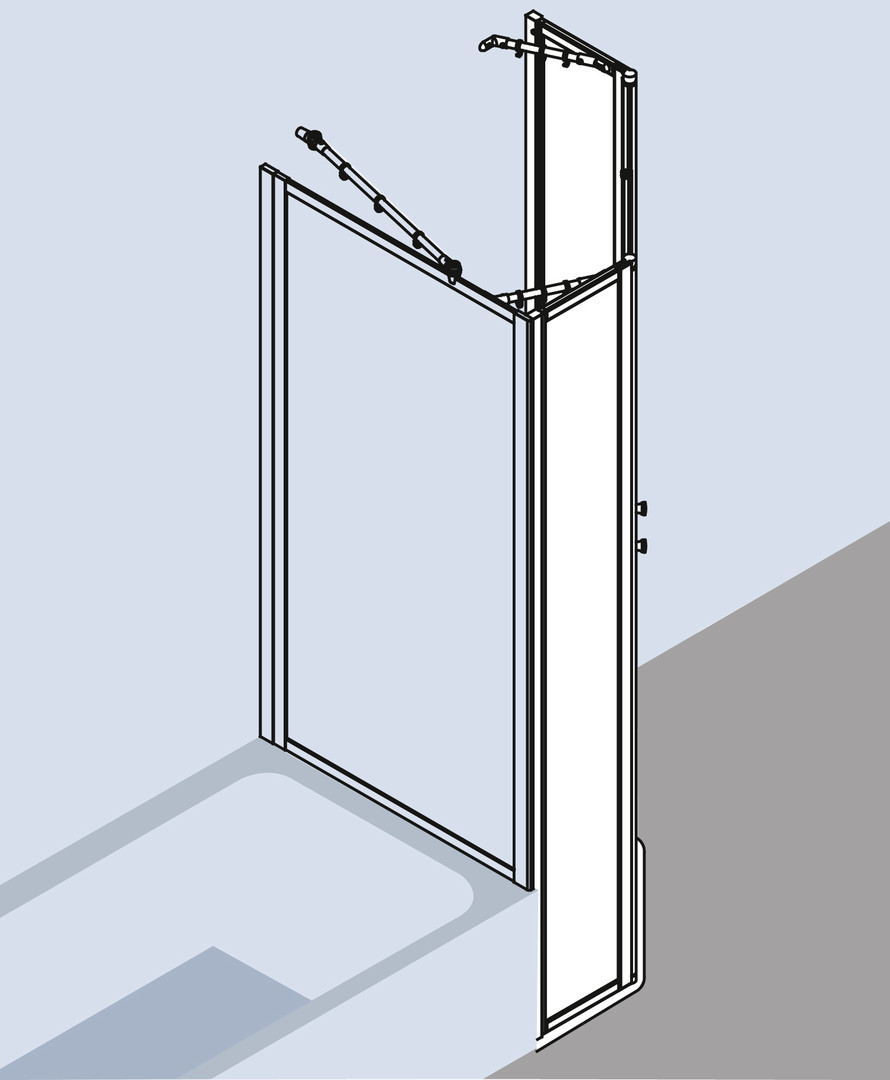 Glasstärke 3/4 mm, mit 2 Türflügeln, nach innen und außen öffnend, mit 2 Festfeldern, mit Stabilisierungen (innen), Profile aus eloxiertem Aluminium, Griffe aus Kunststoff, Verstellmöglichkeit im Wandprofil 17 mm, Türprofile mit Hebe-Senk-Mechanismus, durchgehende Magnetleisten und Dichtprofile, mit Bodenschwelle (Höhe 16 mm), mit Befestigungsmaterial