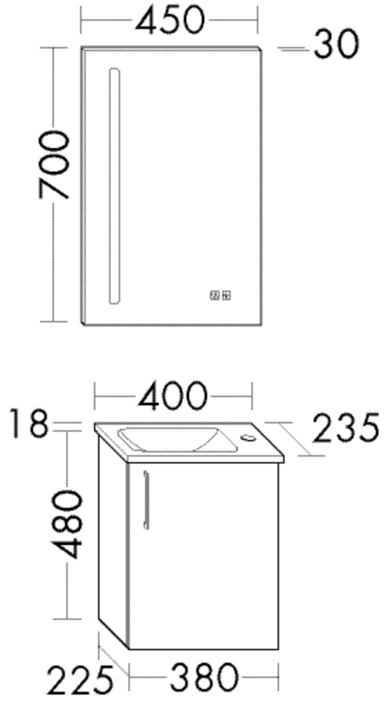 Spiegel, LED-Beleuchtung, 5700 K, 1 Sensorschalter: ON/OFF, 1 Spiegelheizung, 38 W, 1 Sensorschalter: Spiegelheizung, Korpus Spiegel Alu-Optik, IP44, Keramik-Waschtisch, Muldentiefe: 75 mm, Beckenmaß 270 x 160 mm, reversibel, nicht absperrbar, Sicherheitsablaufventil nicht im Lieferumfang enthalten, Waschtischunterschrank