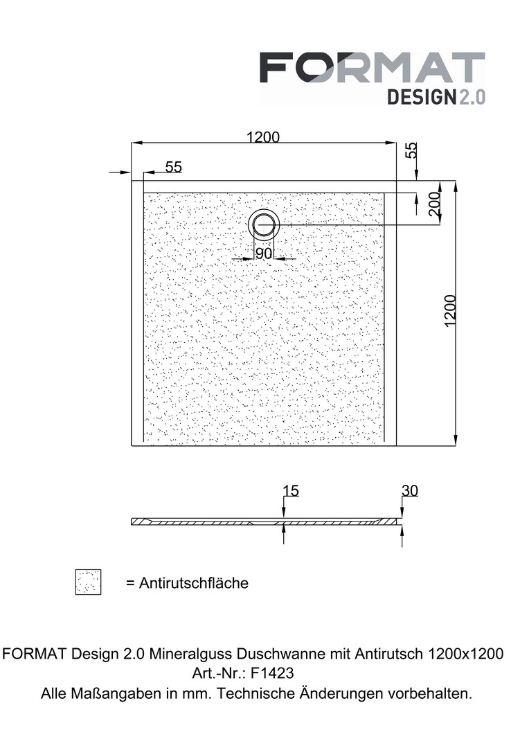 FORMAT Design 2.0 Duschwanne Mineralguss 120 x 120 x 3 cm, weiß, Ablauf kurze Seite, mit Antirutsch