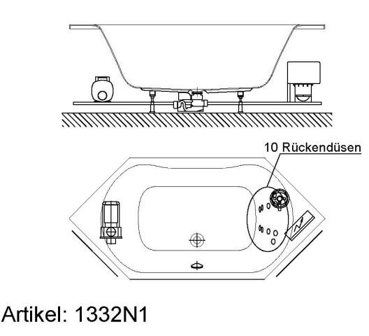 aus Acryl, in Sanitärqualität, Ablauf mittig versetzt zur Überlaufbohrung hin, mit bereits verbauten Gestell und Überlauf- sowie Ablaufgarnitur, Ablauf Ø 52 mm, aus Plattenmaterial tiefgezogen, rückseitige Glasfaser-/Polyesterverstärkung und zusätzliche Stabilisierung im Bodenbereich