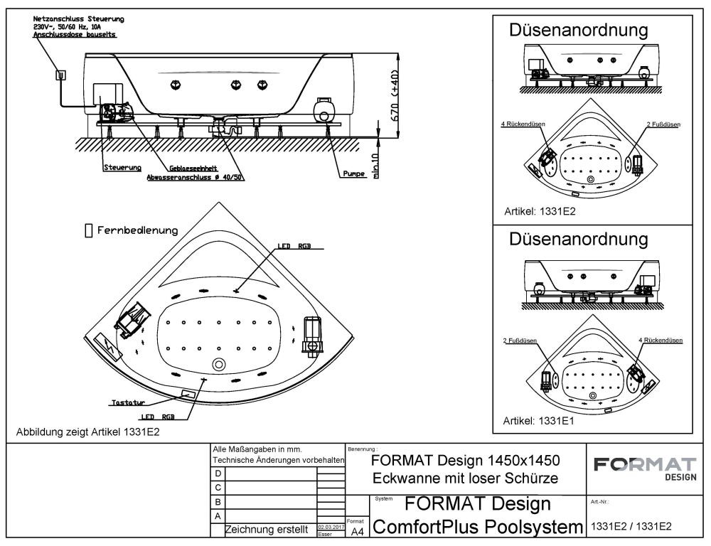 FORMAT Design Eck-Poolwanne 145 x 145 cm, ComfortPlus, Rückendüsen rechts, weiß, mit Schürze