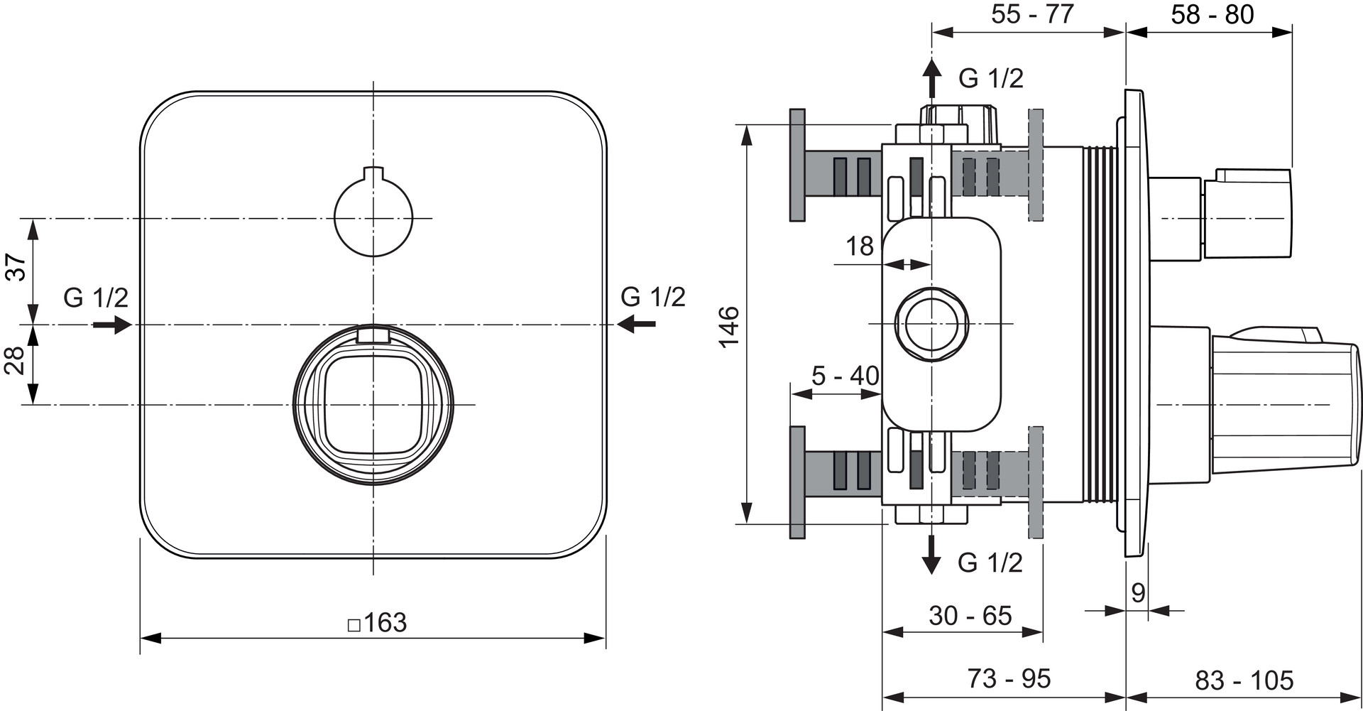 alle sichtbaren Designteile, integrierte Vorabsperrung, Rückflussverhinderer, Rosettengröße 163mm x 163mm, Thermostat-Kartusche mit Wachsdehnstoffelement mit integrierter Heißwassertemperaturbegrenzung, Abdichtung DICHT-FIX System (separate Abdichtung jeder Öffnung für optimalen Schutz des Bauwerks gegen Feuchtigkeit und Wasser) Geräuschverhalten DIN 4109, Gruppe I, Montage nur in Verbindung mit Unterputz-Bausatz 1, Vectron-Box Modell-Nr.: A1140NU