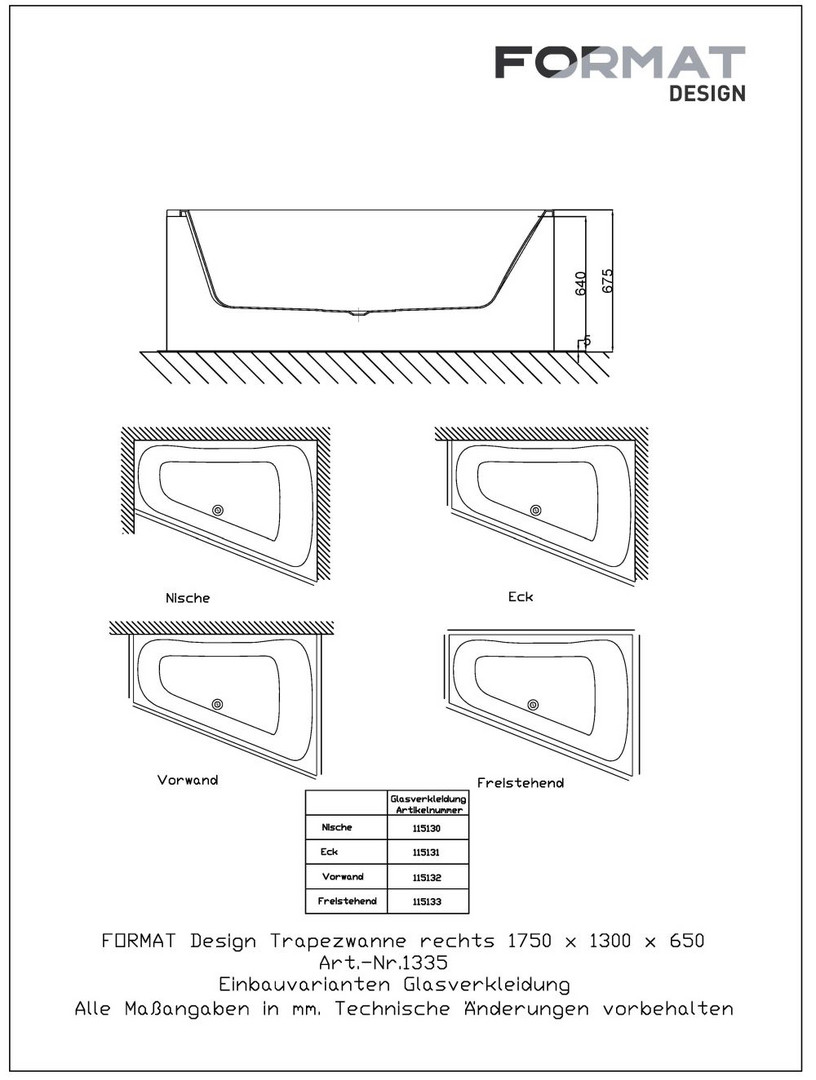 FORMAT Design Glasverkleidung zu Trapezwanne 175 x 135 cm, rechts, schwarz, für Nische