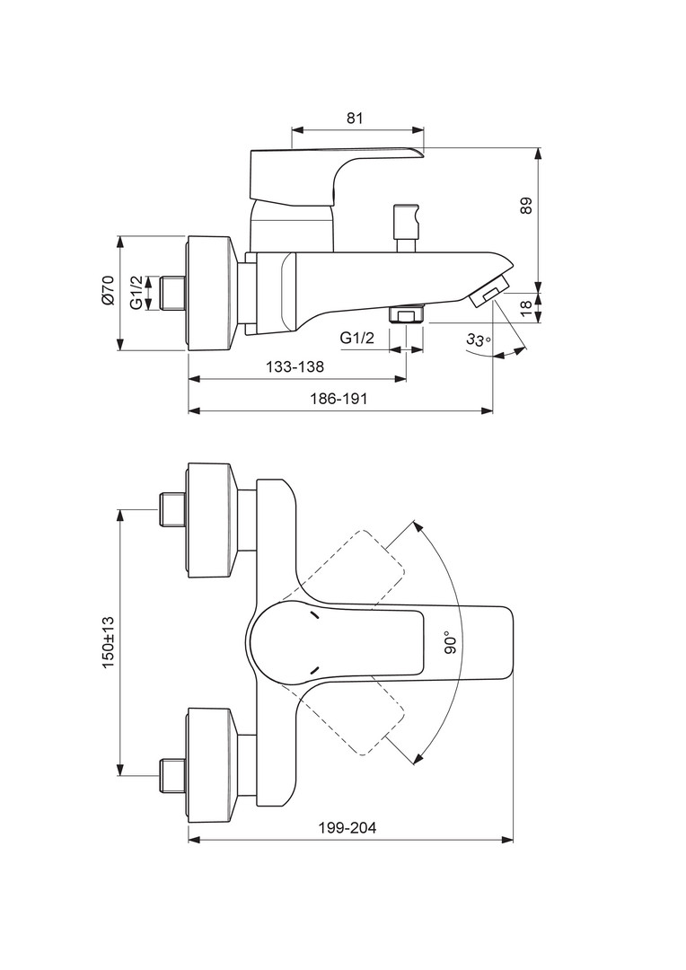 AP, DN 15, mit Rückflussverhinderer, DVGW-Eigensicher, Ausladung 186 mm, S-Anschlüsse geräuschgedämpft, verstellbar von 137-163 mm, Bedienungshebel aus Metall, Umschaltung automatisch von Brause auf Wanne, Kartusche Ø 40mm mit keramischen Dichtscheiben, Kartuschenübersetzung aus Edelstahl, Schwenkbereich 90°, mit integriertem Fettreservoir (lebensmittelverträglich), mit integrierter Heißwassertemperaturbegrenzung, Lebensdauertest EN 817, Geräuschverhalten DIN 4109, Gruppe I