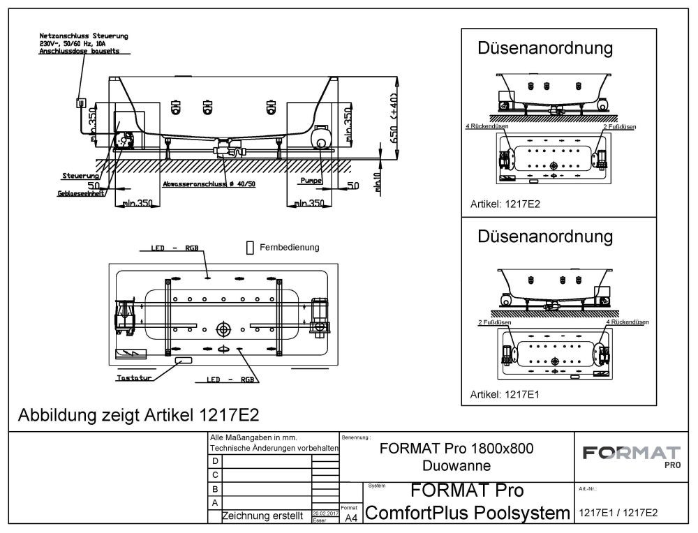 FORMAT Pro Poolwanne 180 x 80 cm, ComfortPlus, Rückendüsen rechts