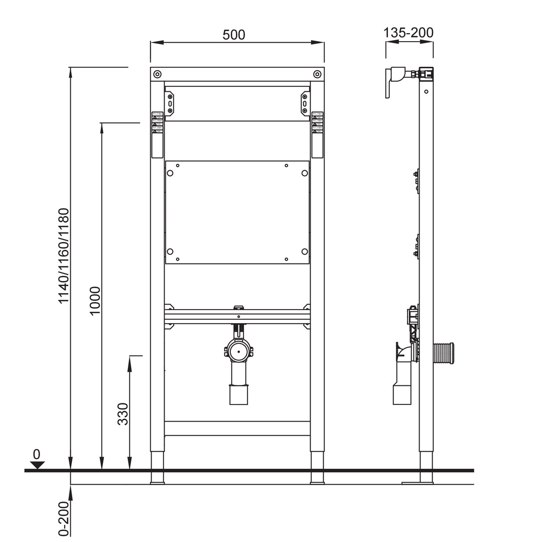 als Vorwandelement im Trockenbau oder in einer Ständerwand einsetzbar, verschweißte selbsttragende Konstruktion aus pulverbeschichtetem C-Profil 40 x 40 mm, vormontierte Wandhalter und verstellbare Fußstützen 0-20 cm, mehrfach verleimte wasserfeste Befestigungsplatte aus Furnierholz, in der Höhe verstellbare Halteplatte für Wandscheiben, in der Höhe verstell- und schwenkbarer Ablaufbogen DN 40/50 mit Gummidichtung für Anschlussrohre DN 32 und DN 40, Schutzkappe für Rohbaumontage und Befestigungsmaterial, ohne Beplankung, B/T: 500/135-200 mm