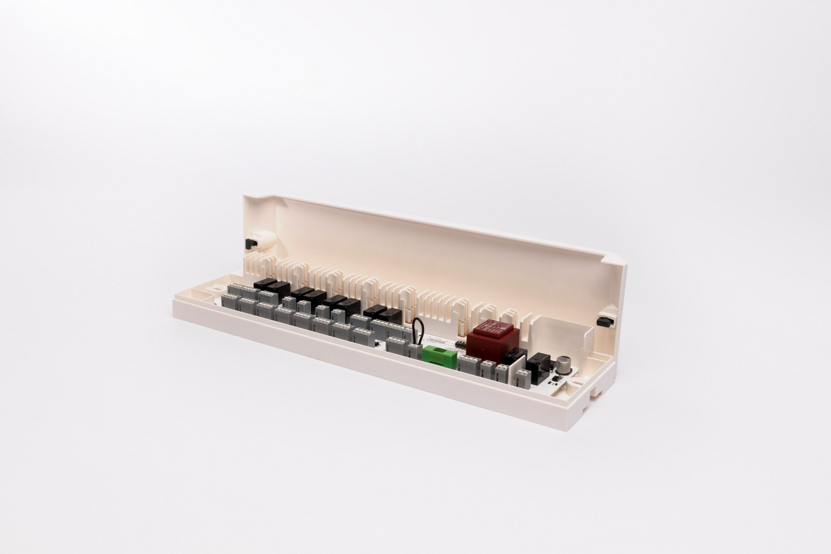 mit integriertem TÜV zertifiziertem "automatischem hydraulischen Abgleich", führt selbstständig und ohne den Anschluss von zusätzlicher Hardware den Abgleich durch, kann durch invertieren der Eingangssignale von Standard-Heizen Reglern auch Kühlen abbilden, es können marktübliche 230 V-Heizen-Regler angeschlossen werden, hochwertiges modernes Design, Ausführung in 230 V-8-Zonen/Raumregler, erfüllt die Vorgaben der Energiesparverordnung, BAFA förderfähig, automatische Erkennung angeschlossener Regler, einfache, intuitive Installation, Bedienung und Wartung, ohne Vor-und Rücklaufführer, Signalisierung des Status durch LEDs, Anschluss für bis zu 17 Stellantriebe, Ausgangszustand NC, Pumpen-und Kesselsteuerung, Anschluss für Taupunktsensor und Absenkeingang, bewährte Kabelführung und Zugentlastung, schraublose Steck-/Klemm-Anschlusstechnik