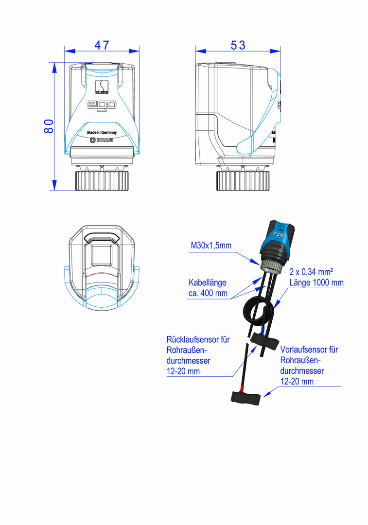 M 30 x 1,5, intelligent autonomer elektrothermischer Regelantrieb für den automatischen hydraulischen Abgleich der Heizkreise eines Heizkreisverteilers, für die Funktion des EGO ist ein Zweipunkt-Raumtemperaturregler erforderlich