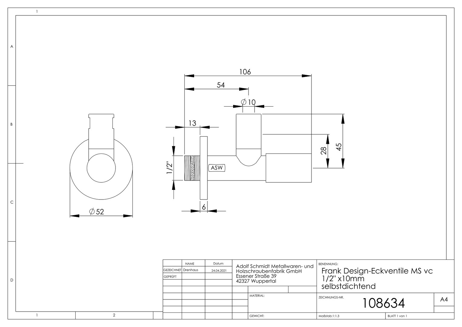 FRANK Design-Eckventil Messing verchromt, 1/2" x 10 mm, selbstdichtend