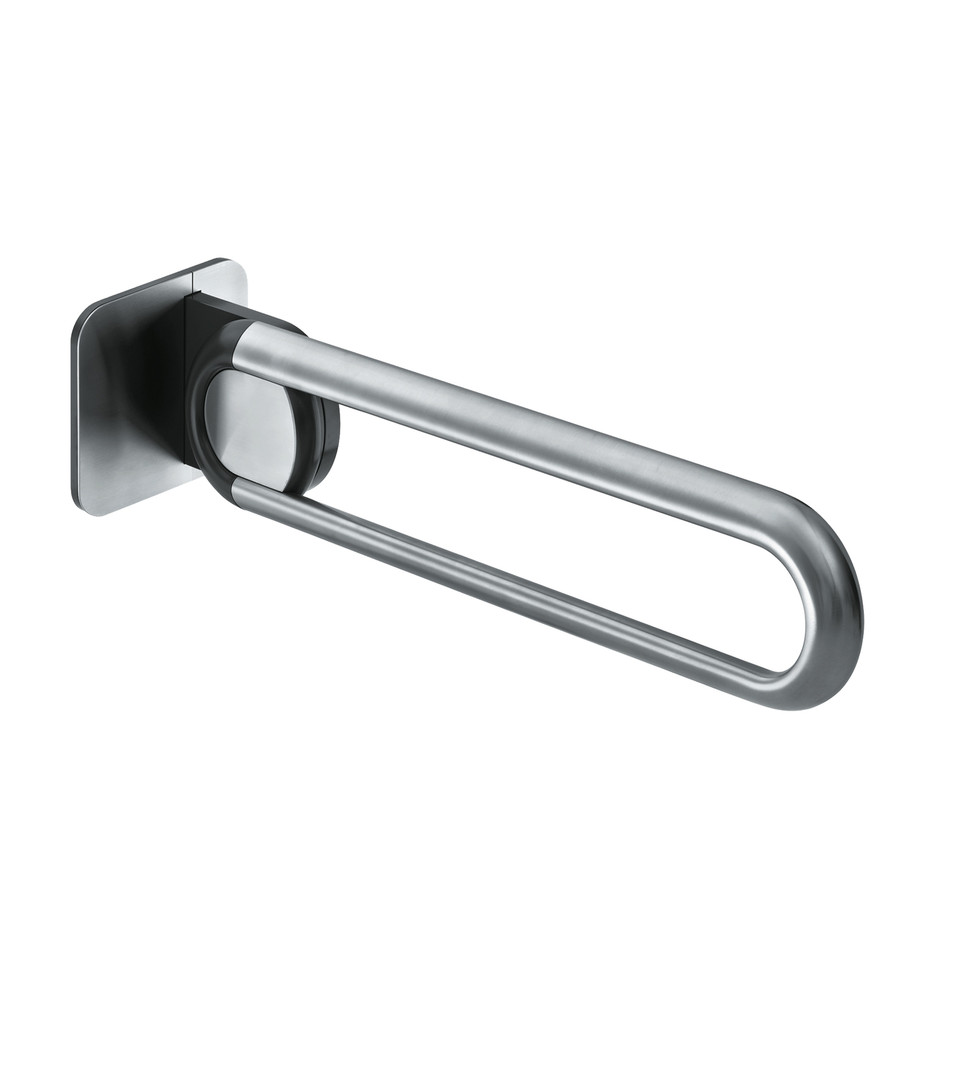 für Waschtisch und WC-Bereich, einstellbare Federbelastung, Handgreifform elliptisch durch Ovalrohr 36,5 x 22 mm mit 45°-Schrägstellung, Befestigung verdeckt durch Abdeckblende aus Edelstahl, Wandhalterung aus Zinkdruckguss, schwarzgrau (RAL 7021), 160 x 160 mm, mit 60 kg seitlich belastbar, mit 100 kg von oben an der Vorderkante, kompatibel mit TECE-Gerontomodul bzw. TECEprofil 9.042.016, Befestigungsmaterial 82 8299 09033 0000 für TECE-Gerontomodul (separat zu bestellen)