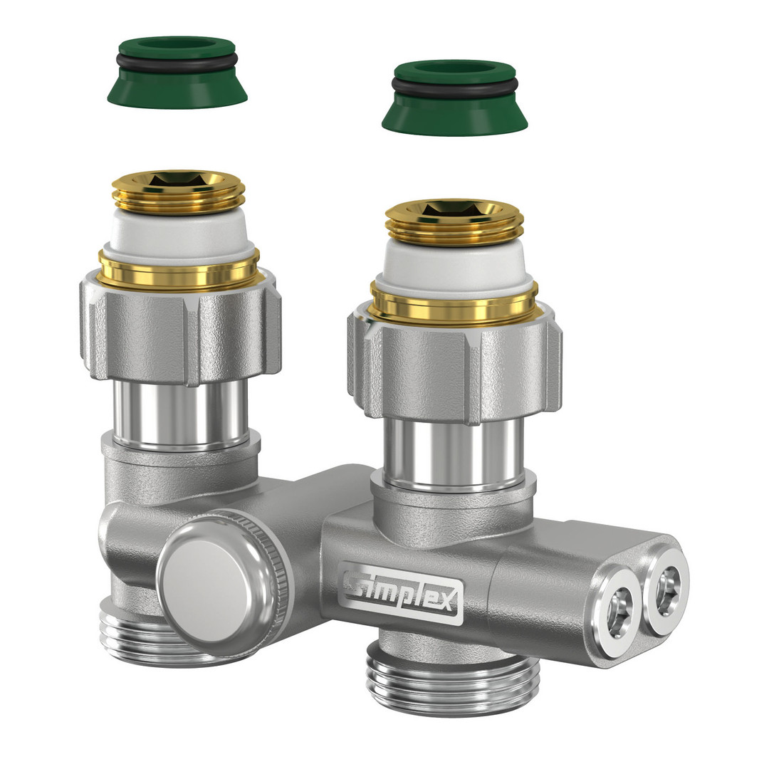 kompakte und absperrbare Anschlussarmatur für Ventil-Kompaktheizkörper, für Einrohr- und Zweirohrsysteme nutzbar, Heizkörperanteil 30-100 % (werksseitig eingestellt auf 35 %), Bypass zur stufenlosen Einstellung bei Einrohrbetrieb, mit selbstdichtenden Anschlussnippeln und Konusteilen für Ventil-Kompaktheizkörper mit Rp 1/2 oder G 3/4 M (Eurokonus), Hahnblock-Anschluss, rohrseitig mit Eurokonus für den Anschluss mit Klemmverschraubungen, 50 mm Achsabstand, für kreuzungsfreien Anschluss bei vertauschter Vor- und Rücklaufleitung, mit Rückwärmebremse zur Vermeidung ungewollter Schwerkraftzirkulation, Dichtmaterialien aus EPDM, max. Betriebstemperatur: 110 °C Dauertemperatur/130 °C kurzzeitig, max. Betriebsdruck 10 bar