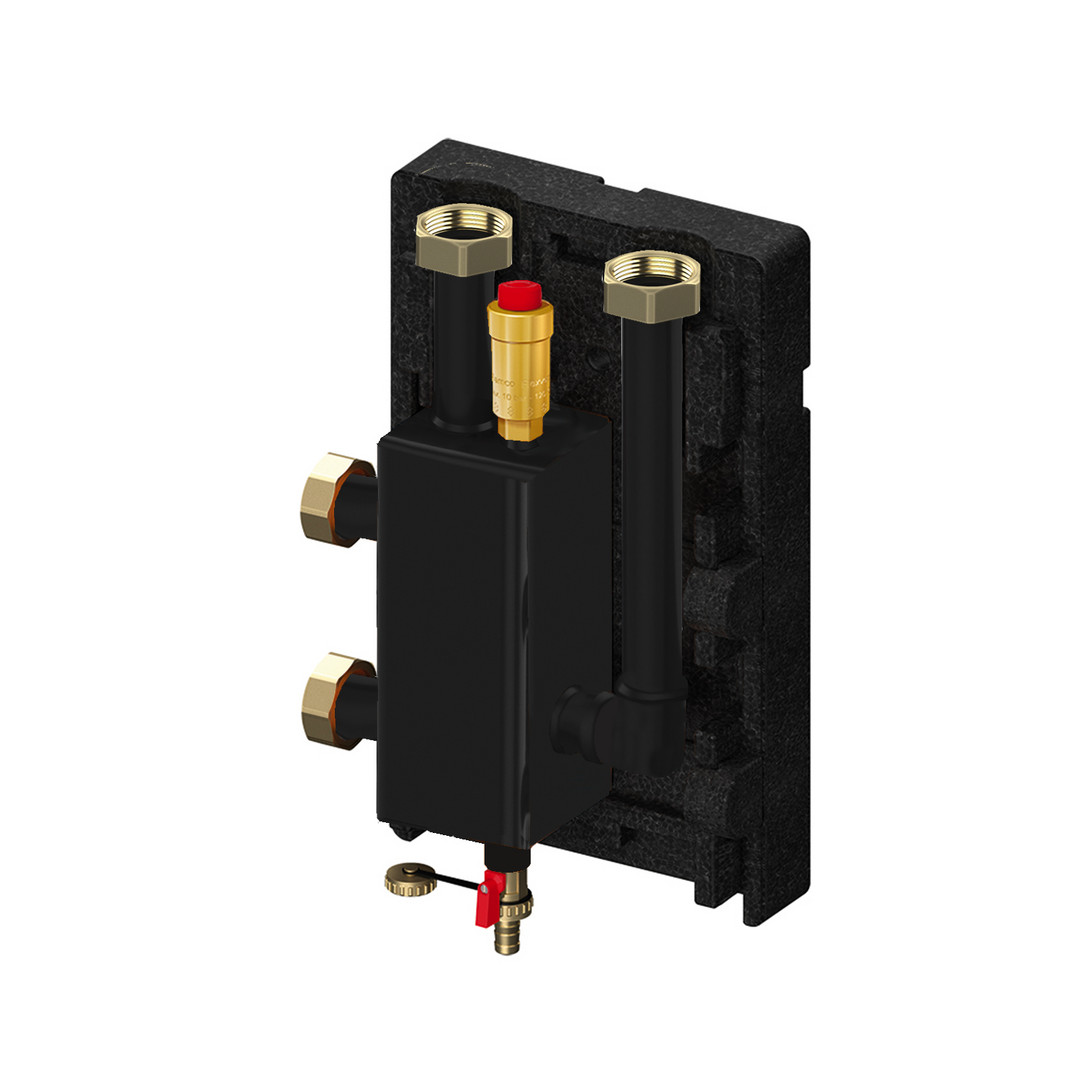 zum Kesselanschlusssystem bis 70 kW, wahlweise mit hydraulischer Weiche (orange) oder ohne hydraulische Weiche (schwarz), mit Luft-/Gasabscheider, Schmutz-/Schlammabscheider und Magnetitabscheider, Achsabstand horizontal und vertikal 125 mm, mit Tauchhülse für Vorlauffühler mit Durchmesser bis 10 mm und Isolierung