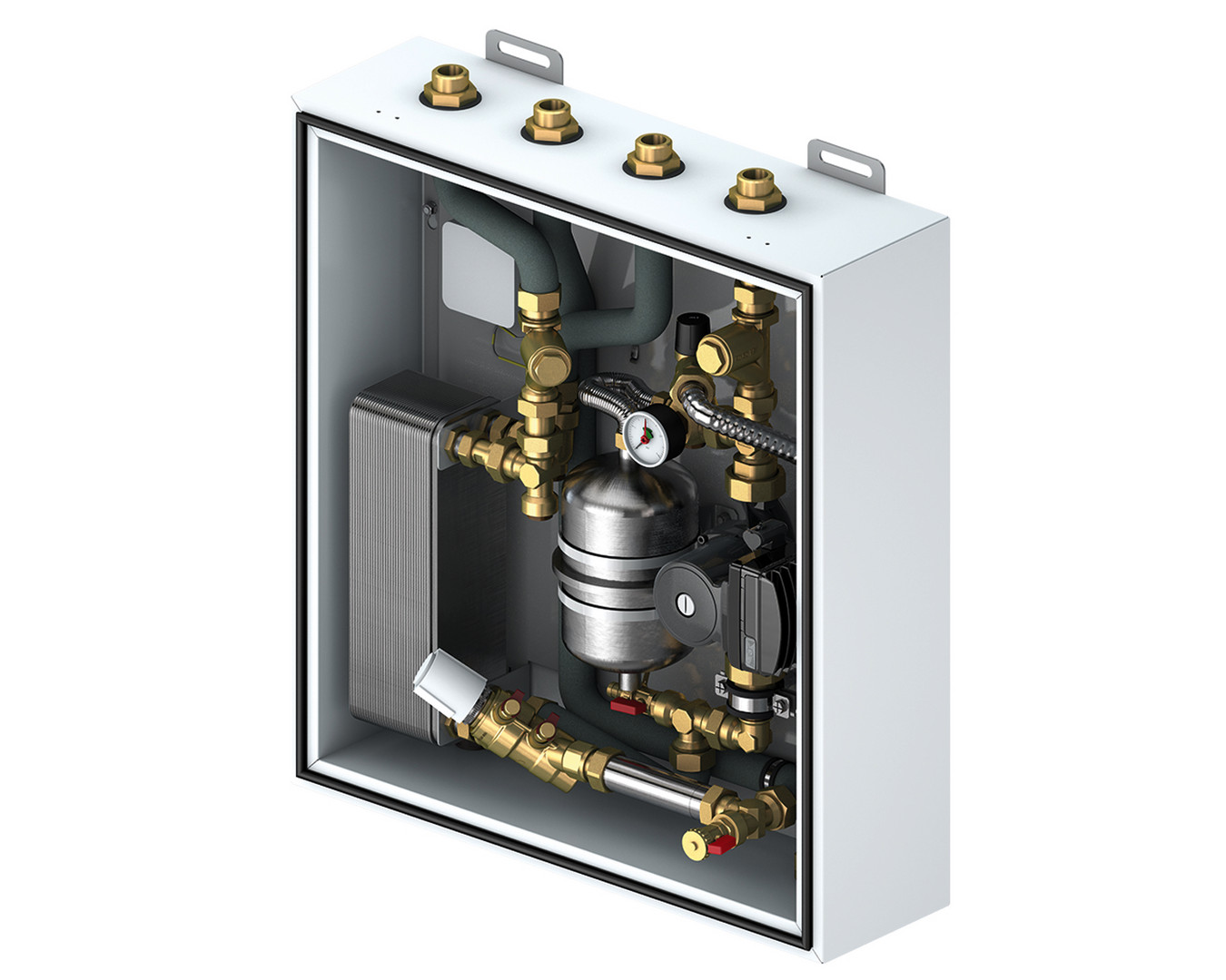 anschlussfertig, für Übertragung von Kühlenergie in Wohnungen, Appartements sowie kommerziellen Gebäuden und Hallenbau, stufenlose primäre Volumenstrom- und Primärenergieeinstellung des druckunabhängigen Volumenstromreglers, Hybrid-Gehäuse, Abschirmung zu Umgebungsbedingungen, max. Druck Primärseite 10 bar/3 bar