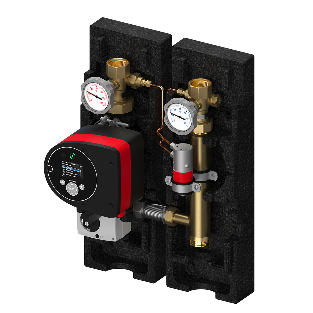 vorgefertigt, isoliert, zur Heizkreisregelung mit Dreiwegemischer, mit Vor- und Rücklauftemperautfühler und Differenzdrucksensor, unterer Abgang 1/2" AG, oberer Abgang IG entsprechend Pumpendimension