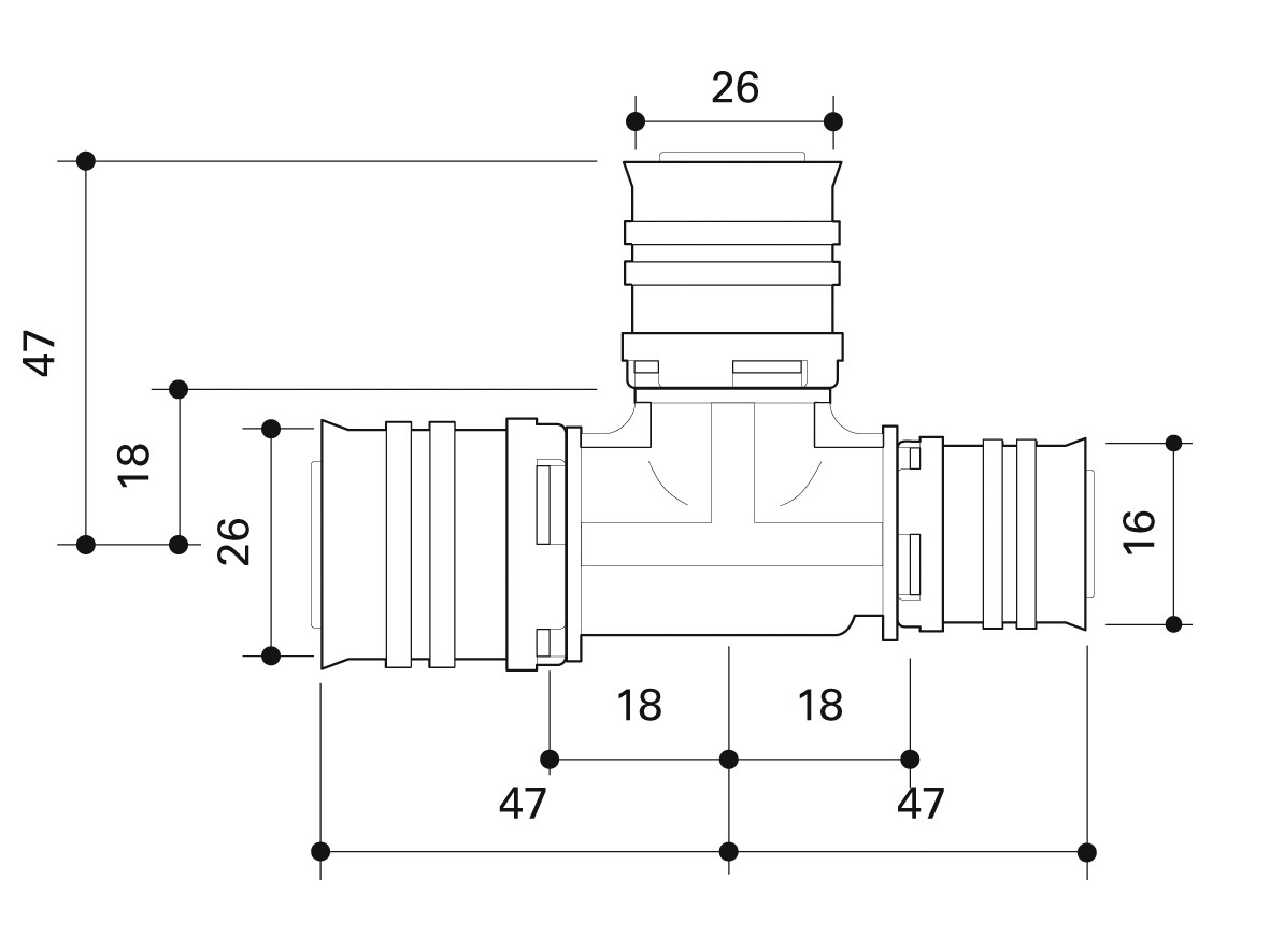 Fränkische T-Stück alpex F50 PROFI 26 x 26 x 16 mm, PPSU, reduziert