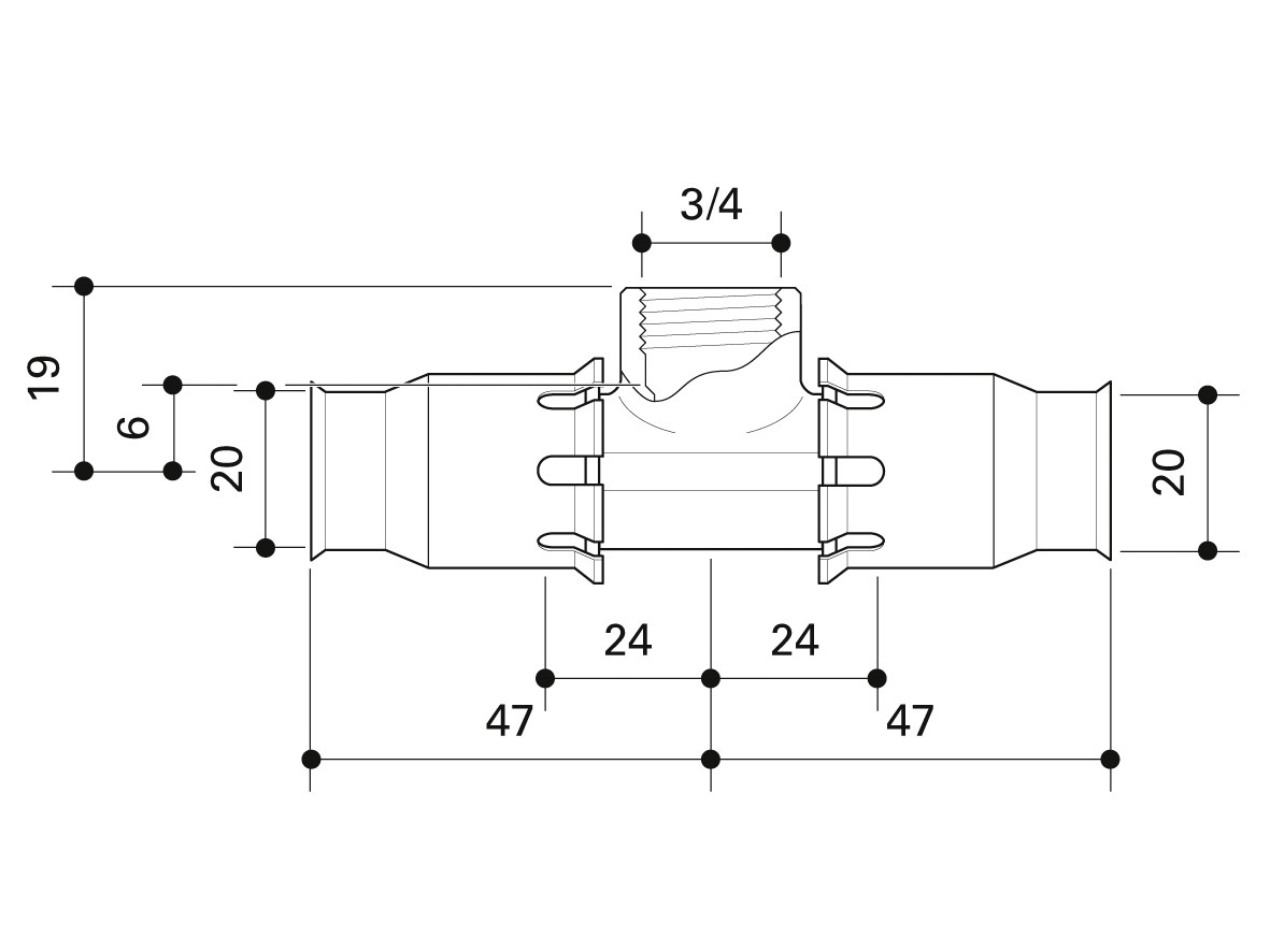 Fränkische Übergangs-T-Stück alpex-plus 20 mm x Rp 3/4 x 20 mm, mit IG, entzinkungsbeständiges Messing