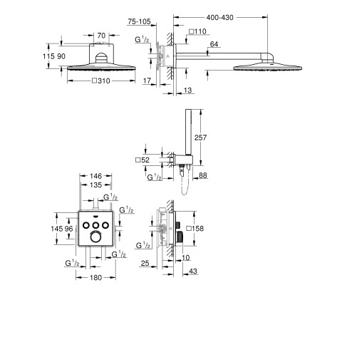 GROHE Fertigmontageset SmartControl UP-Duschsystem, mit 3 Absperrventilen, eckig, chrom