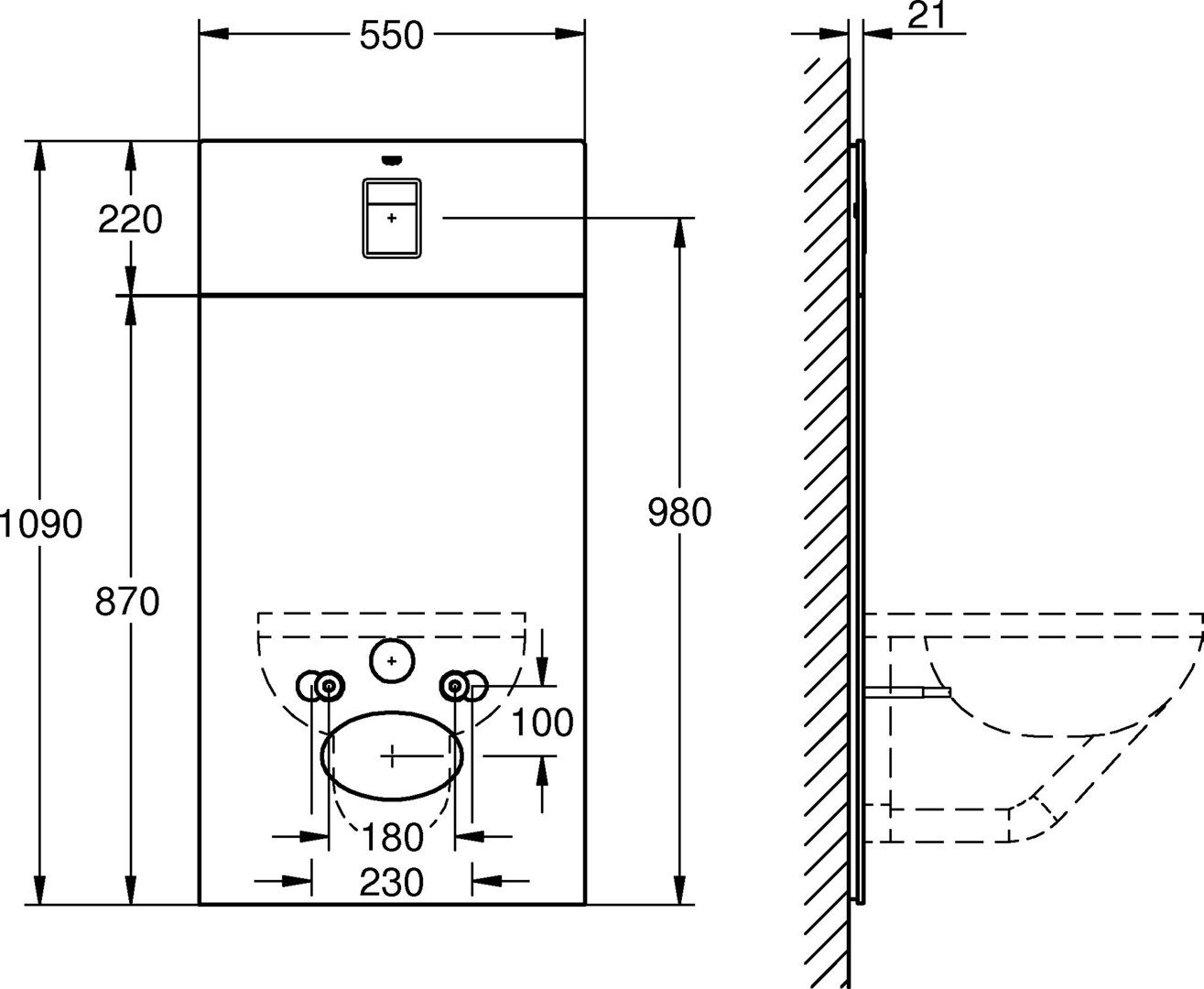 zum Anschließen von Dusch-WC Sensia Arena und gängigen Wand-WCs, für geflieste/verputzte Wandoberflächen, zweiteilige Glasabdeckung, aus gehärtetem Sicherheitsglas (0,8 cm), im Bereich der Revisionsöffnung abnehmbar, Skate Cosmopolitan Betätigung, verchromt, flächenbündig mit Glasabdeckung, HPL-Trägerplatte mit Ausschnitten für alle Anschlüsse, Trägerplatte mit unsichtbarer Wasserzuleitung zum Dusch-WC, mit Acrylumleimer, silber, mit Schallschutzset, mit Zubehör für die Befestigung der Trägerplatte und WC-Keramik