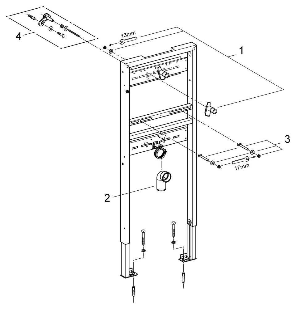 für Vorwand- oder Ständerwandmontage, Stahlrahmen komplett vormontiert, mit Schnellverstellung und Höhensicherung, Befestigungsmaterial, Waschtisch-Haltebolzen M 10, mit Keramikbefestigung, Schraubenabstand variabel, HT-Ablaufbogen Ø 5 cm, Dichtung Ø 3,2 cm, 2 schallgedämmte Armaturenanschlüsse 1/2", Wandwinkel 38 558 00M für Vorwandmontage müssen separat bestellt werden