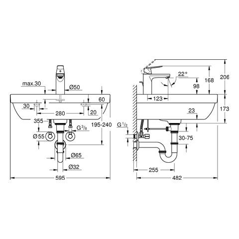 bestehend aus: Euro Keramik Waschtisch 60 cm (39 335 000) Eurosmart Cosmopolitan Waschtischarmatur M-Size (23 325 000) Montageset Eckventil 1/2" (22 039 000) Röhren-Geruchverschluss 1 1/4" (28 947 000)