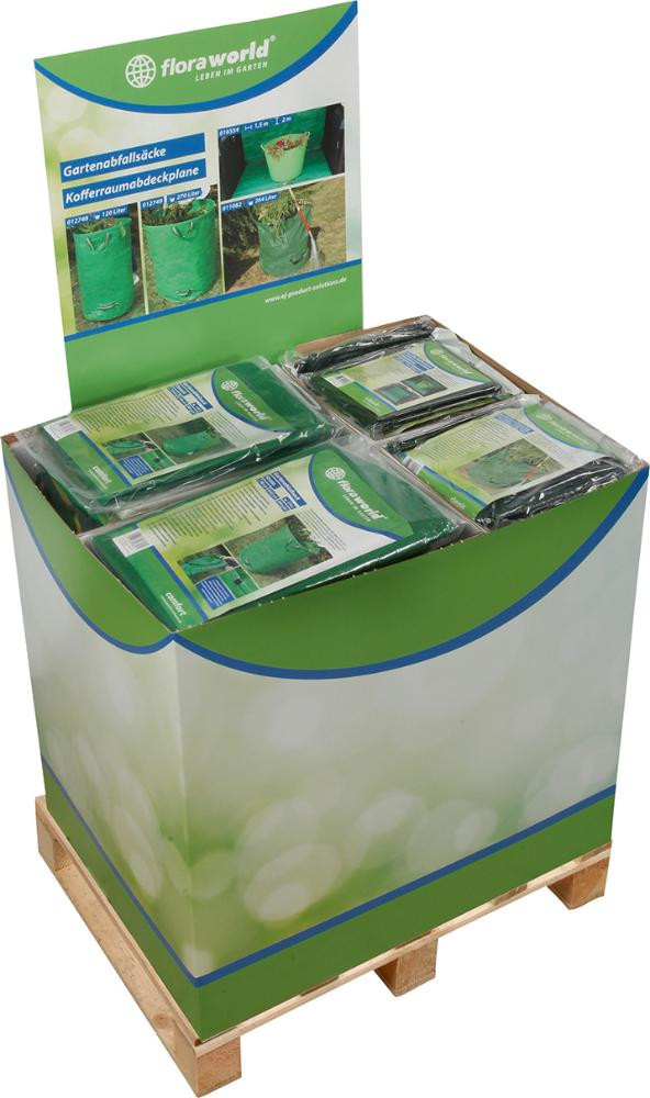 Lieferung: 77 Stück im Display (15 x Gartenabfallsack Favorit Comfort, 12 x Gartenabfallsack Strato Comfort, 30 x Gewebe-Kofferraumabdeckplane Classic, 20 x Gartenabfallsack Big Classic).