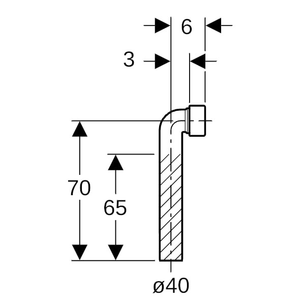 Geberit Anschlussbogen 90° mit Quetschverschraubung: d=40mm, H=70cm, 90°, K=65cm, weiß-alpin