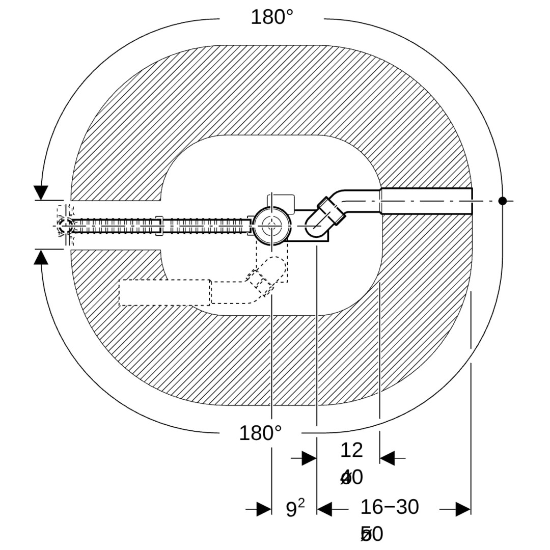 für Badewannen mit Ventilloch Ø 52 mm, aus Stahl, Kunststoff oder Guss, in Spezialgröße, Güteüberwacht nach EN 274-3, mit Überlauf und Zulauf, Überlaufkopf ausgerichtet befestigbar, doppelseitige Dichtungen an Ab- und Überlauf, Einlaufstrahl ausrichtbar, mit Überlaufkopf mit Zulauf, Ablaufventil, Geruchsverschluss, Anschlusswinkel 90° mit MasterFix, 1/2“, radial dichtend, Anschlussbogen aus PE-HD, Ø 40/50 mm, Bauschutz und Befestigungsmaterial